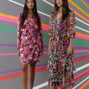 - Model is 5’11” tall, with a 30″ bust, 24″ waist, and 35″ hip measurement, wearing a size 8 – length from center back neck to hem is 51 1/2″.