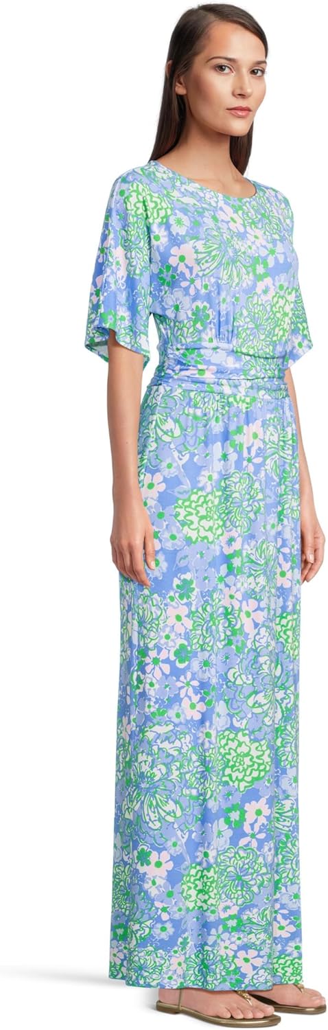 43″ Straight fit, flats length, boatneck maxi dress with back surplice, elbow length kimono sleeves, ruched waistband, and side slit
