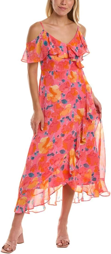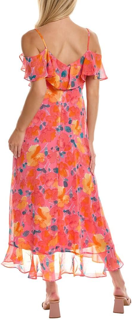 - Spaghetti straps, ruffle cold shoulder, surplus bodice with ruffle detail V-Neck, faux wrap body, and hi-low maxi skirt with cascade ruffle detail.