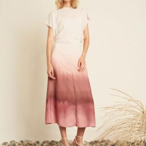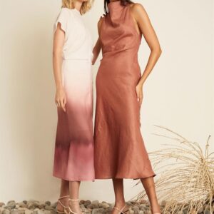 The purposeful drape of the Haze dress is accentuated by its biased cut and captivating ombre print. The longer length and swaying A-line silhouette gracefully flatter the body, while the short sleeves add an effortless touch. Lush satin emerges as a sophisticated everyday core fabric, distinguished by its subtle sheen that effortlessly elevates it for after-work wear. The cool touch and fluidity of this fabric create a delightful sensation against the body, offering a perfect balance of comfort, coverage, and weight.