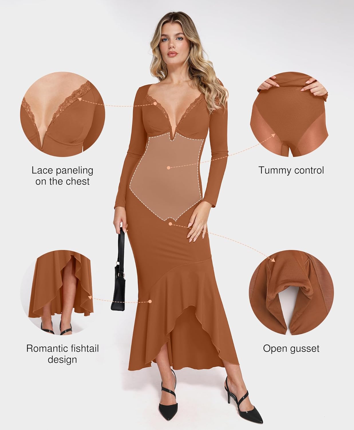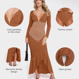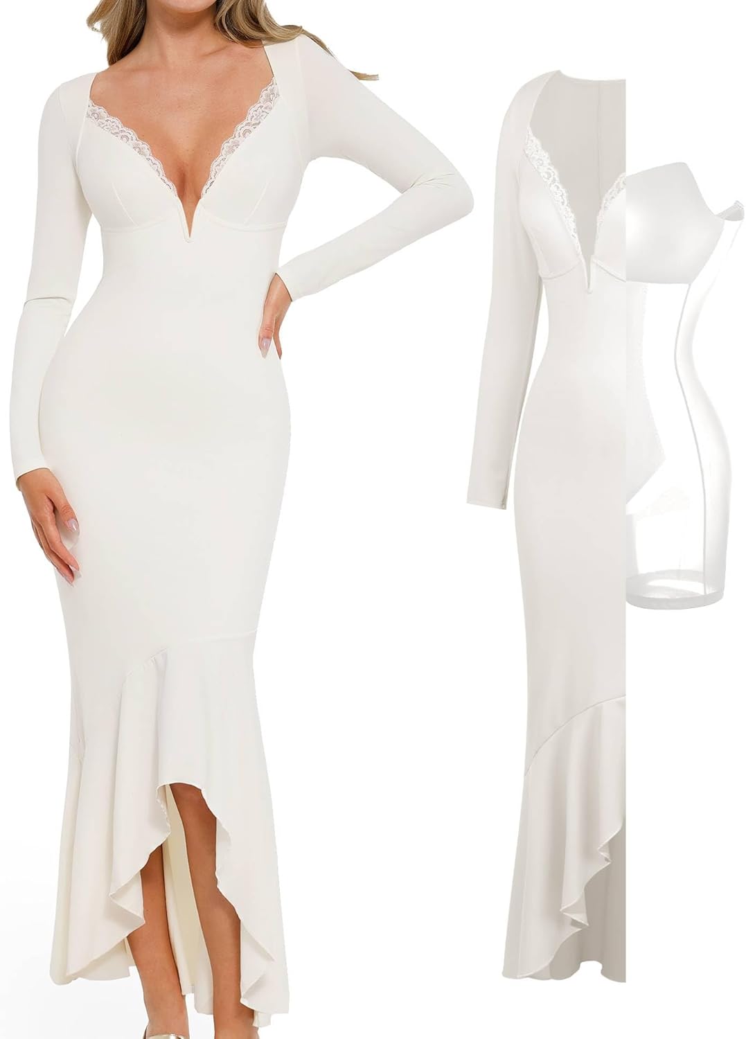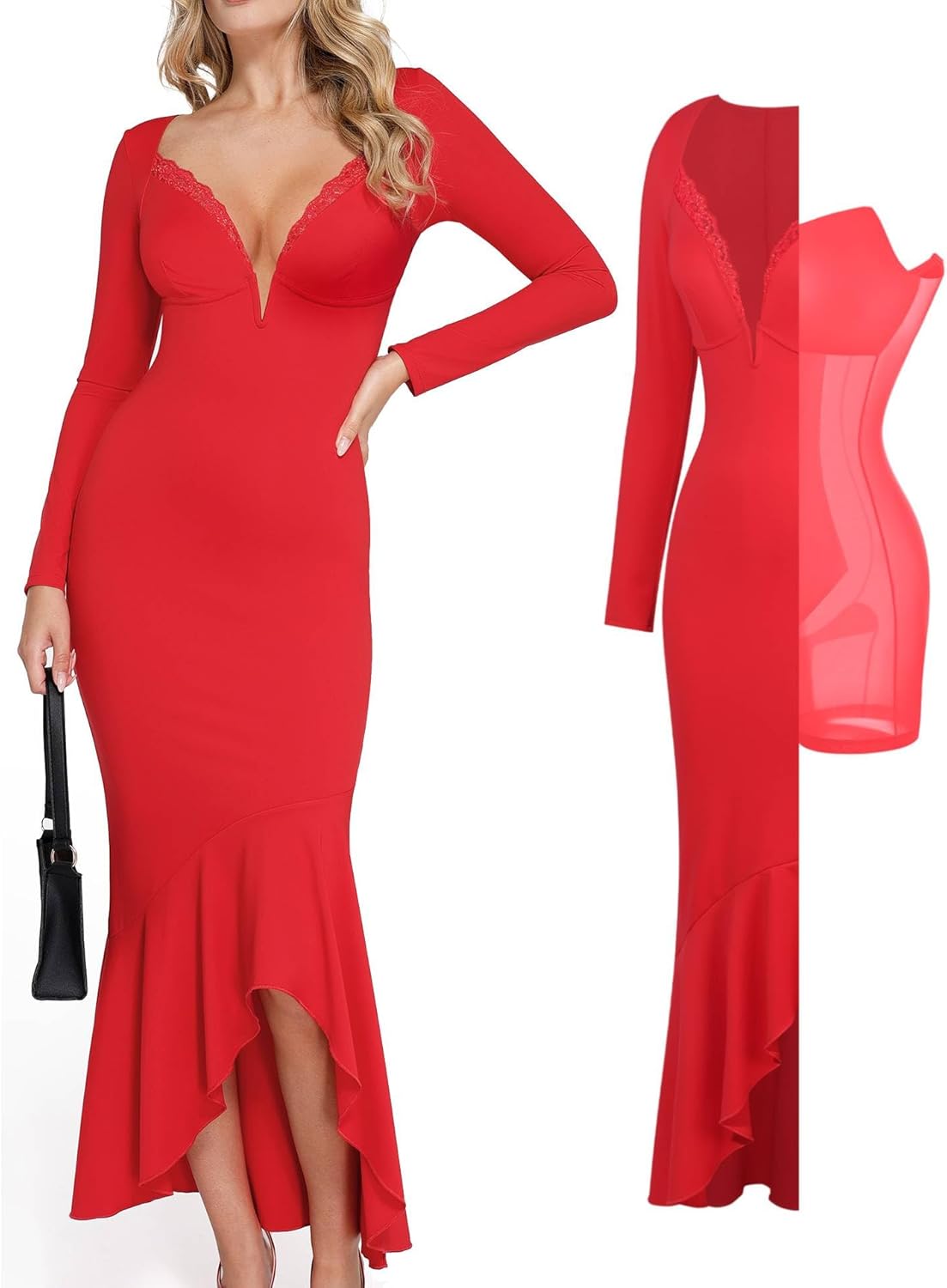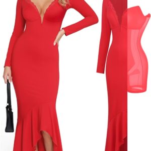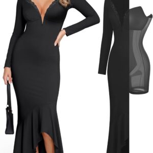 Popilush Long Sleeve Cocktail Dress for Women Shapewear Tummy Control Party Dresses Deep V Neck Lace Mermaid Maxi Dress