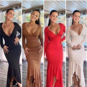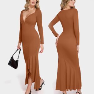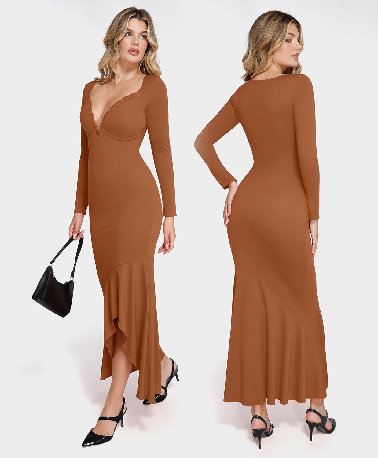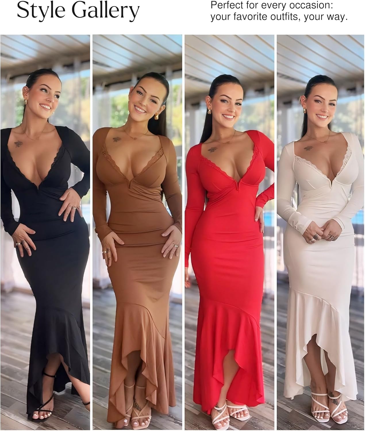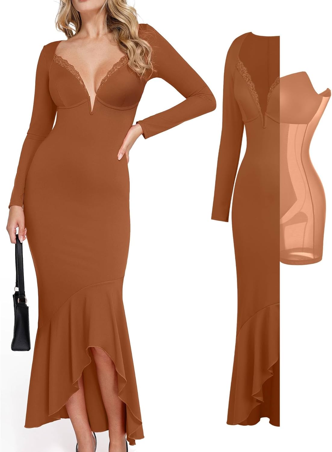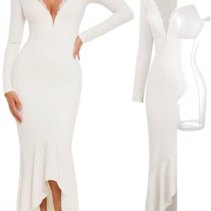 Popilush Long Sleeve Cocktail Dress for Women Shapewear Tummy Control Party Dresses Deep V Neck Lace Mermaid Maxi Dress