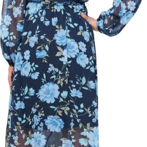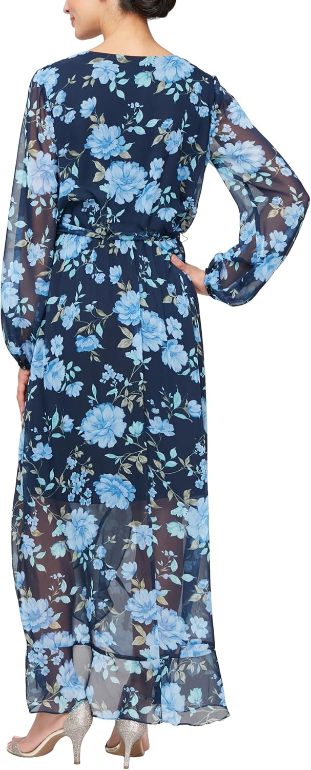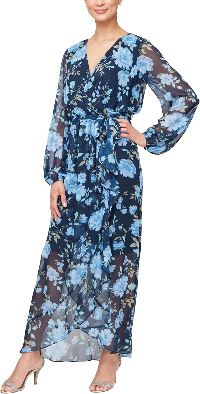 S.L. Fashions Women’s Long Sleeve Tulip Overlay Skirt Maxi Dress with Surplice Neckline and Tie Belt