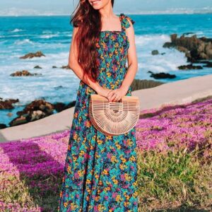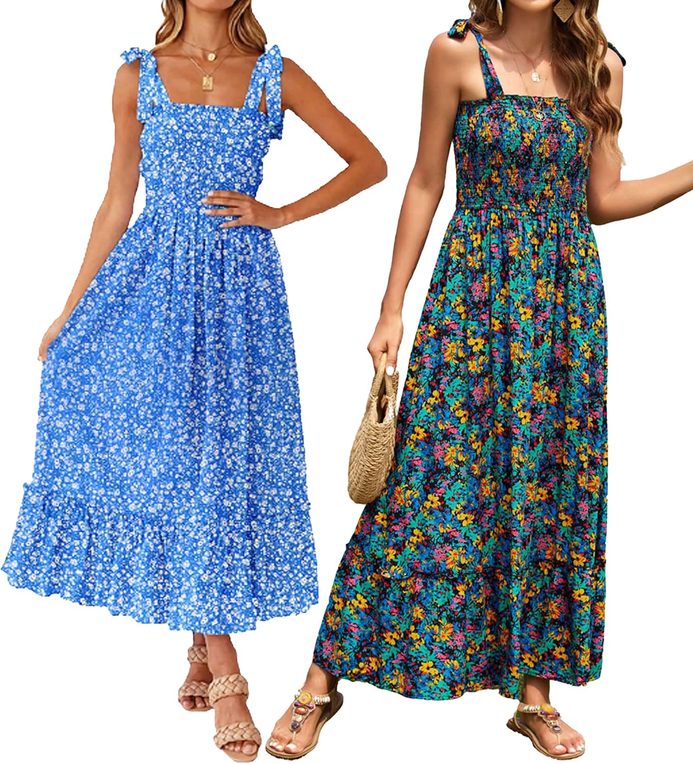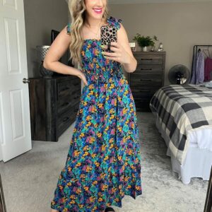 Smocked Dress Womens Square Neck Long Dress Adjustable Strap Boho Dresses For Women Floral Print Dress Sleeveless Maxi Dress Summer Dress For Women Flowy Spaghetti Strap Dress Beach Dresses For Women Flower Dresses For Juniors Midi Long Dress Beach Sundress Bohemian Vacation Dress Tie Strap Dress